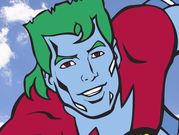 >blue skin>red eyes>power of flight>ability to alter the climate>5 companions>blonde friend with an accent>kind-hearted friend who communes with animals>funny colored mullet hairstyleoh how I love captain planet