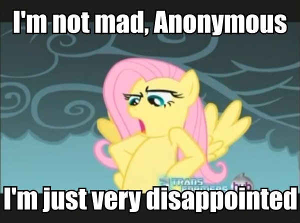 Spike: Hey, you're Anonymous, aren't you? You're the one Twilight keeps talking about— Twilight: SPIKE! Spike: Oops, aheheh. I guess I wasn't supposed to tell you that part. |